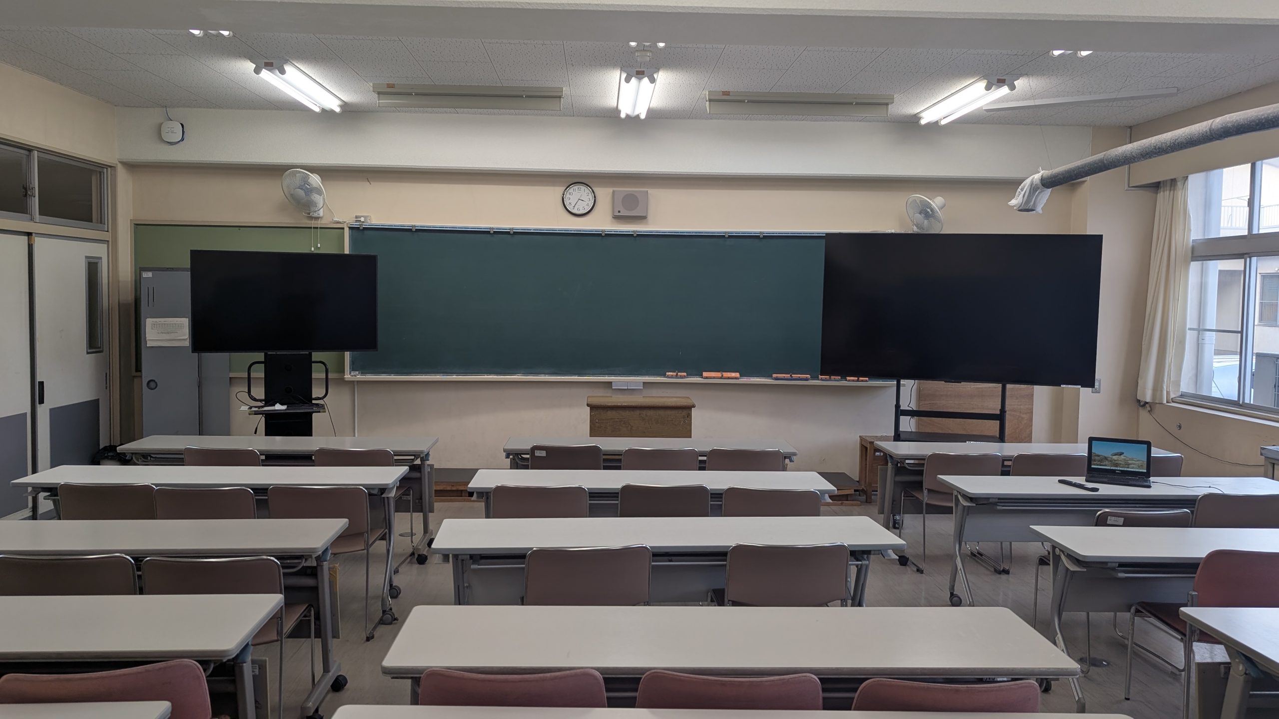 これまでの55インチモニターは教室の隅々から見るには小さく、プロジェクターでは光発色が弱く、準備も大変でした。この度のモニターは、大きさと発色性だけでなく、無線で速やかにPC接続が可能で、生徒・教員共に目を輝かせていました。更に、昇降対応スタンドは、教室から移動させる事が難しい大型モニターの教室移動が可能となり、大変重宝しております。