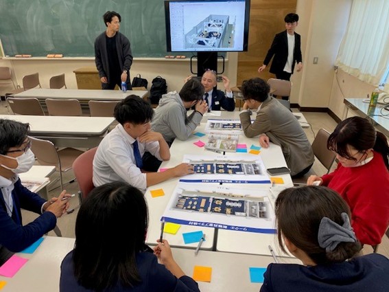 今までの職員室とは全く違うカフェのような空間イメージや青を基調としたスッキリとした空間イメージのデザインが提示され、参加者のワクワク感が止まらない中、2グループに分かれてデザインの検討を行いました。