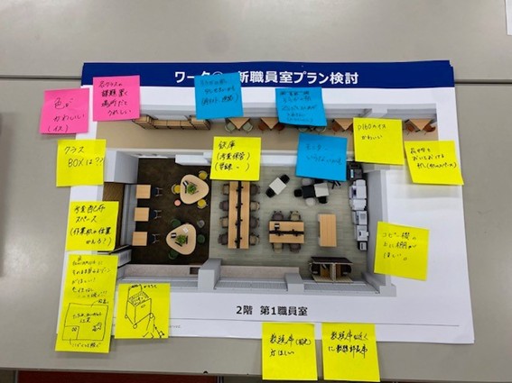 今回のアイデアや意見をもとに、次回は各部屋のコンセプトを打ち出し、教職員の働きがいや魅力向上が図れる職員室の実現に向けて具体的な活動に入っていきます。