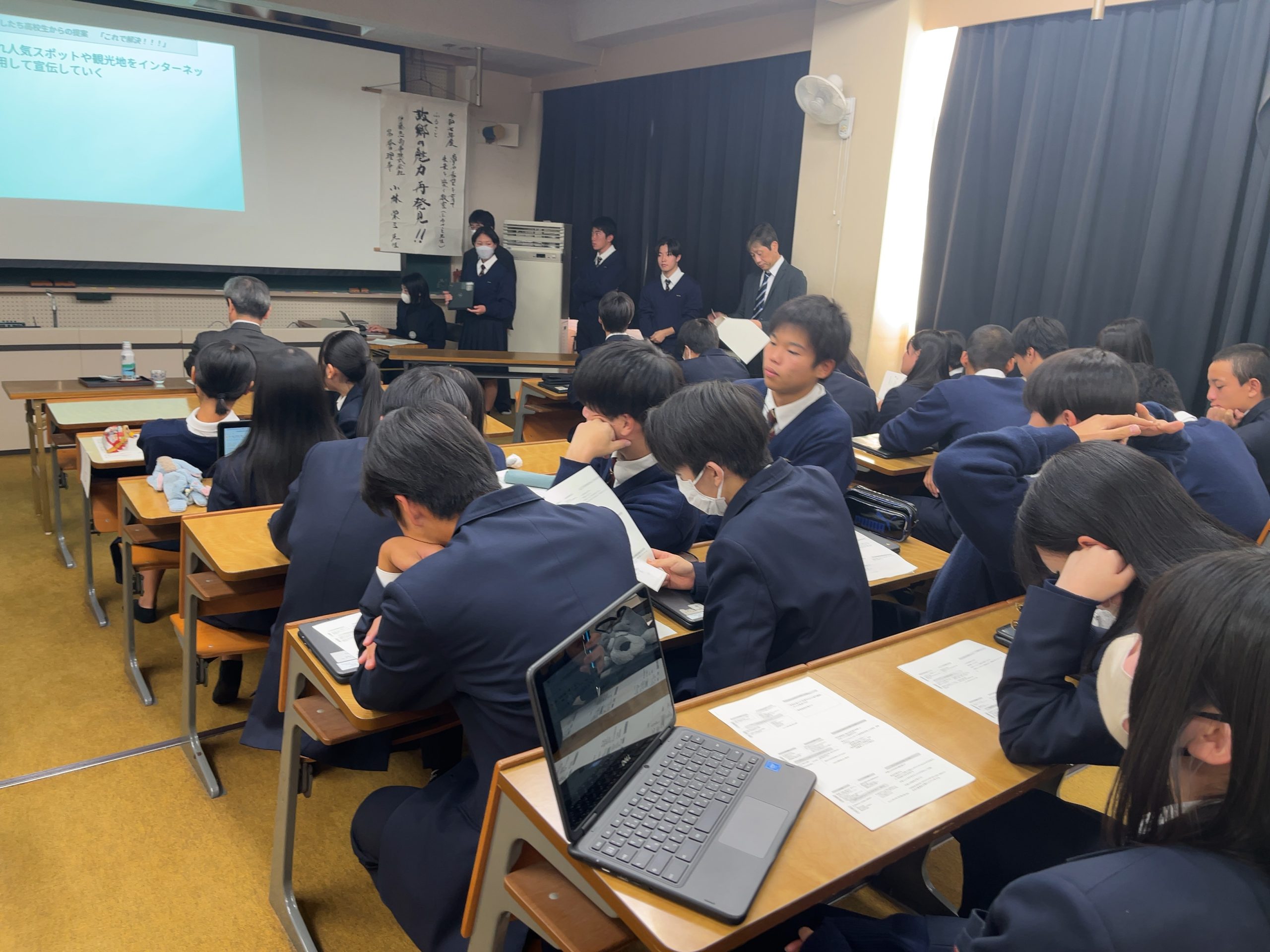 小林先生の講義では、生徒たちが「小浜市の子育てについて」「熊川宿の空き家の活用」「伝統産業の衰退」などのグループで立てたテーマに対して、「地域・地元」「全国・世界」のそれぞれの視点でプラス要素とマイナス要素をまとめるSWOT分析を行い、高校生からの提案として対応策を考えました。