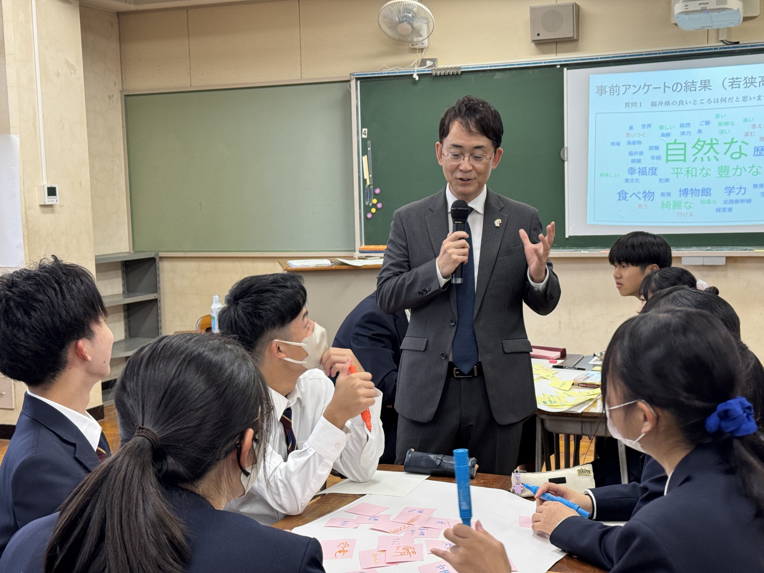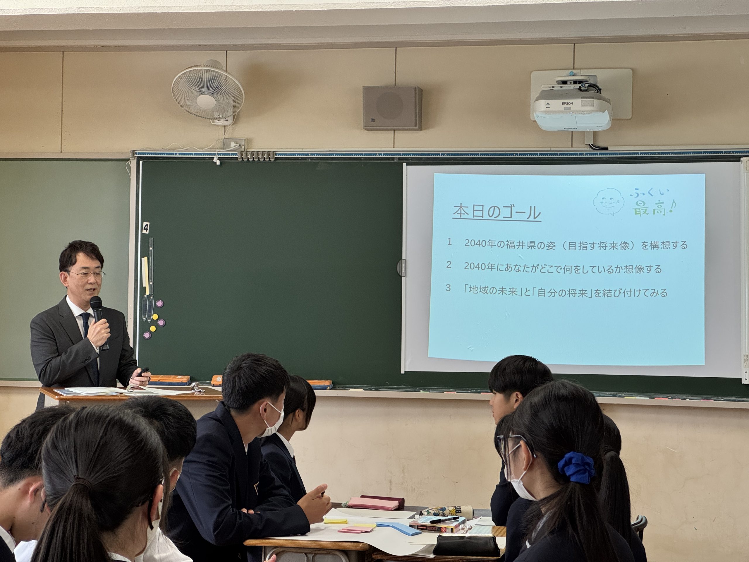 2年国際探究科の生徒らが参加し、福井県の良いところや課題を考える中で、これからの福井の姿や目指す将来像を予測し、自分の将来と地域の未来を構想するという探究的な学びを行いました。