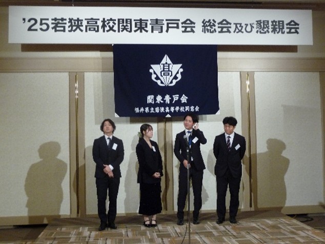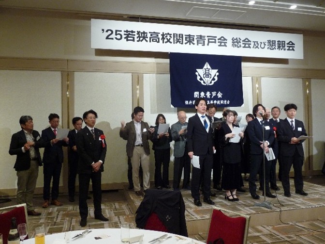 総会では、青戸会会長藤本さんから会員増強活動への助成金を贈与頂いた後、渡邉校長より学校の現状と未来に向けた教育活動についてご報告いただき、母校の歩みに触れる貴重な機会となりました。また、猪嶋小浜市副市長からは、小浜市の魅力とまちづくりの取り組み食を核とした地域振興と健康づくり、北陸新幹線小浜・京都ルート実現に向けた展望についてご講話いただきました。さらに、同窓生である 上馬 勇さん、青戸会副会長の桂田さんからは、若狭の人々が長年抱いてきた新幹線への思いや、地域の未来にかける熱いメッセージをお聞きしました。懇親会では、世代を超えた同窓生同士の交流が深まり、笑顔あふれる時間となりました。そして最後には、参加者全員で 校歌を斉唱。声を合わせて歌うことで、青春の日々を思い起こし、会場全体が大きな一体感に包まれました。次回は2年後、京都での開催を予定しています。皆様のご参加をお待ちしております。